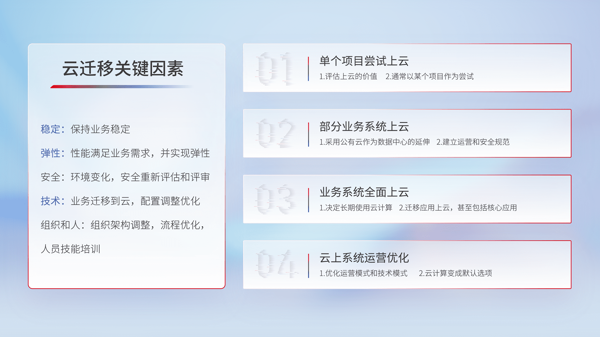 结合实际业务,,从规划设计、、云平台选型、、、云原生改造、、、数据迁移、、集成交付,,,迁移全过程为客户识别最佳上云路径,,,,做好风险识别管理,,,,设计网络架构、、、、身份权限、、安全审计合规、、操作审计、、、、日志审计、、、监控告警策略、、、、多站点容灾设计等,,对云上基础设施进行整体规划,,,提升IT治理水平,,以满足弹性、、、高可用、、、、高性能的需求。。。